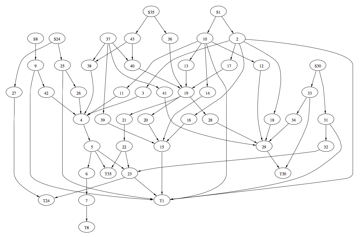 S35 -> 43; S30 -> 31; S30 -> 33; 9 -> 42; 9 -> T1; 25 -> T1;