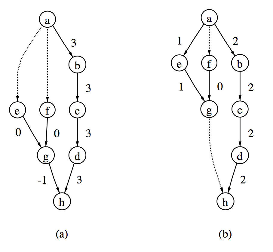 在dot软件中,跨层级边的标签文本表示为偏离中心的虚拟节点。这个设计保证了标签文本和其他节点、边或者标签重叠。需要进行额外的调整才能使得添加标签文本不影响边的长度。设置最小边长为 2(在创建虚拟节点的时候可令层级数翻倍),并让层级之间的间隔减半,以补偿标签节点。这样一来绘制带标签图形成本也至少会翻倍,但保证了标签的可读性。图 5-5 显示了边带标签文本的图。