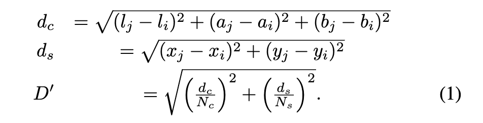 与中心点的距离定义关系到“图片会被怎样分割”,是整个算法的核心,也是计算量最大的、需要花最多精力优化的地方。SLIC 把距离分成两种,一种是空间距离,就是像素点的 x、y 坐标计算的距离,另一个是色彩空间距离,为了最终结果在视觉上更符合直觉,它选用的是 LAB 色彩通道。最终的距离就是这两个距离加权之后的结果: