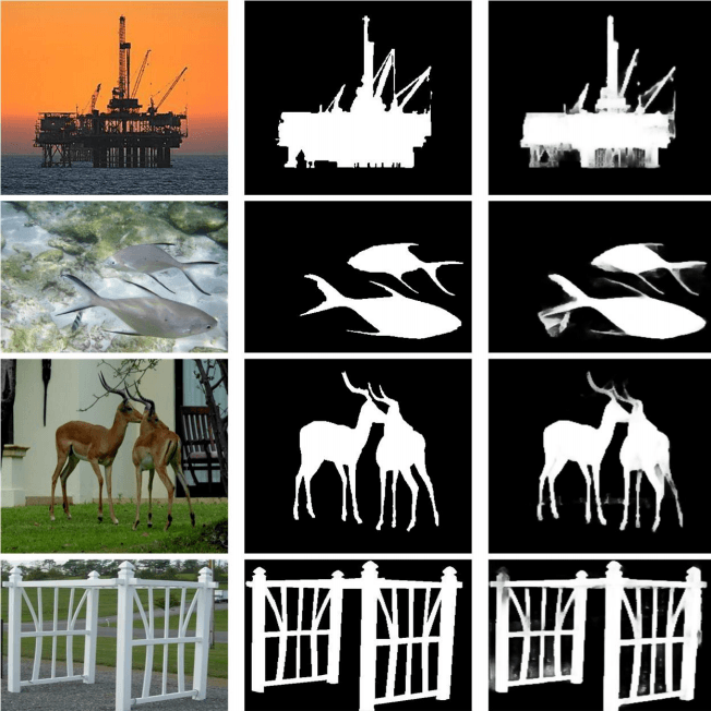 某篇论文里对于 SOD 效果的配图。左图是原始图,中图是人工标注的真实结果(ground true),右图是算法提取的结果