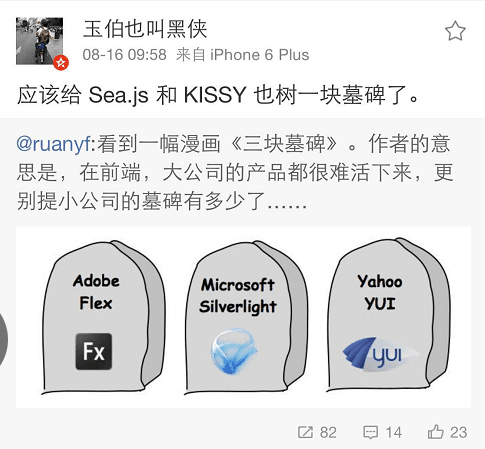 })这是那个时代国内模块加载器的巅峰之作 SeaJS 定义并遵从的模块定义标准。SeaJS 当时火到什么程度呢,它不只是阿里系的前端全套工程化体系的基座,甚至也是竞对腾讯内部大型前端项目的依赖。当年知道 QQ 空间也是用 SeaJS 做的模块化,那种震撼还是印象挺深的。不过在 2015 年附近,Node.js 社区已经如日中天,Module bundles 也已经确立其工程化的统治地位,React 开始方兴未艾的时候,玉伯挺低调地给 Sea.js 竖了一块墓碑: