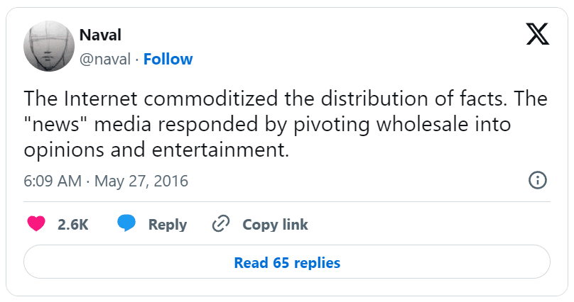 互联网让事实传播平民化。而“新闻”媒体的应对则是:全面转向观点迎合与内容娱乐